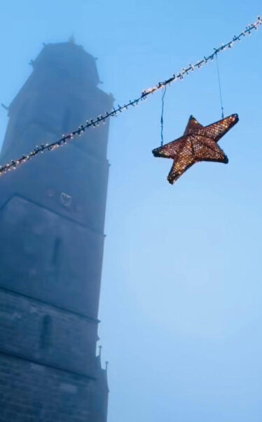 El invierno vuelve la ciudad hacia sí misma. La nieve suaviza los tejados y las luces navideñas brillan con calidez sobre las casas de entramado de madera.